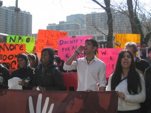 This afternoon, politicians joined representatives from the ACLU’s New York chapter and several student advocacy groups to decry the statistics as evidence that police involvement in schools leads to racial discrimination and a fearful environment. As a ring of police officers looked on, advocates rallying outside of NYPD headquarters said they would like the City Council to revisit the issue of the NYPD role in schools now that the council’s Student Safety Act is is in effect.