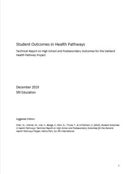 This brief presents findings from the Oakland Health Pathways Project (OHPP), a joint initiative of Oakland Unified School District, Alameda Health System, and Alameda County Health Care Services Agency. The initiative is designed to improve educational and long-term employment outcomes for youth of color in Oakland (Alameda County), California, while expanding and diversifying the local health care workforce. It applies Linked Learning, an approach to college and career preparation that combines classroom learning with real-world work experiences. This brief compares health pathway students’ outcomes with those of students who had similar demographic characteristics and prior achievement but were in two other programs of study: 1) traditional high school programs, and 2) other career-themed pathways. The study found health pathway students significantly outperformed traditional high school students on the high school course credits earned, high school graduation, college eligibility requirements met, and college enrollment. There were no differences in health pathway student outcomes in high school English Language Arts and math achievement, and dropout rates when compared to students in traditional high school programs and other career-themed pathways. In addition, health pathway students were no different in completion of college eligibility requirements and, among those who enrolled in college, were no more likely to enroll in a 4-year (rather than 2-year) college when compared to students in traditional high school programs and in other career-themed pathways.
